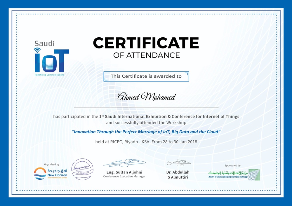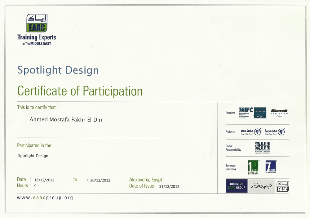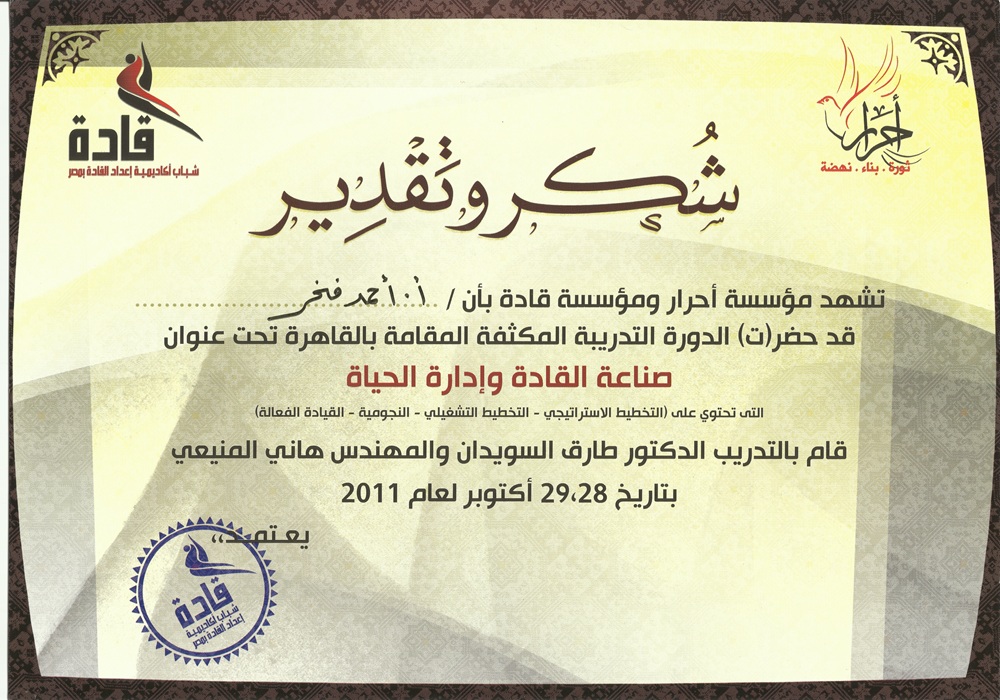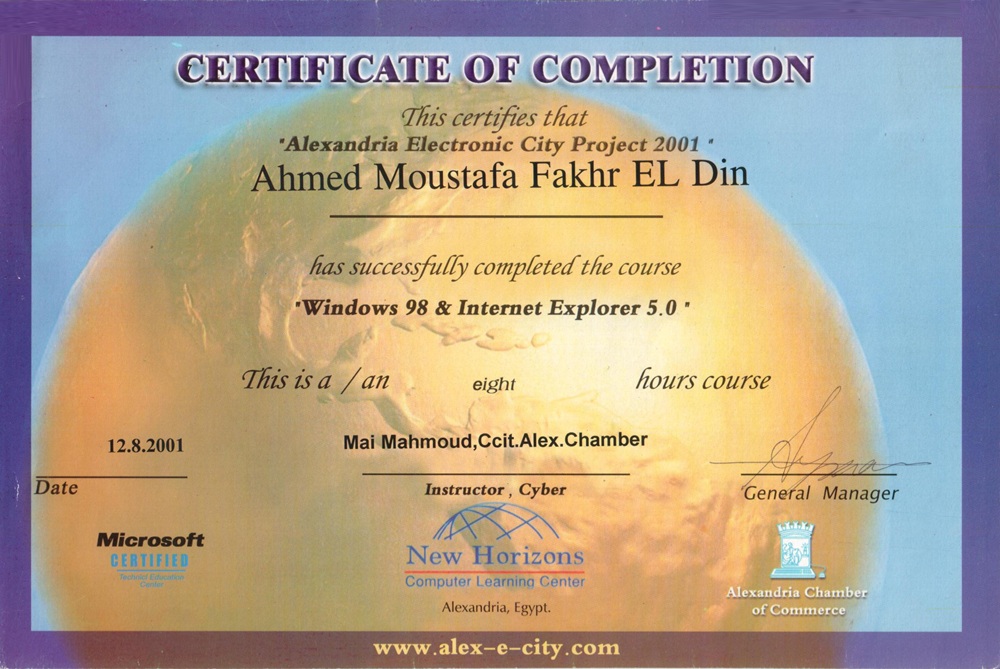 شهادة معتمدة من مايكروسوفت في نظام ويندوز 98 ومتصفح إنترنت إكسبلورر 5، صادرة من معهد نيوهورايزن، بمدة تدريبية قدرها 8 ساعات.