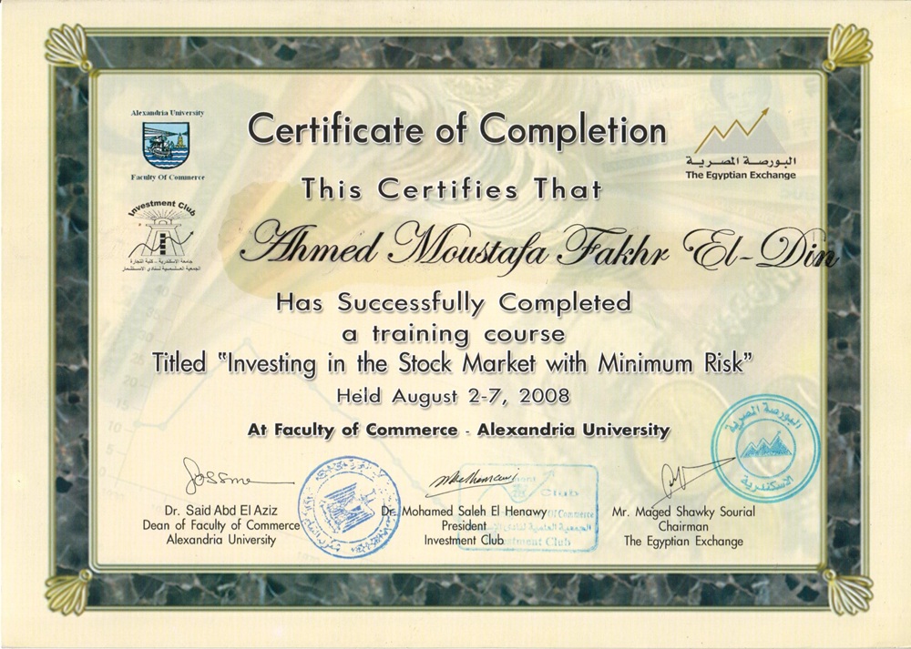 شهادة معتمدة من البورصة المصرية في سوق الأوراق المالية والأسهم، تشمل الاستثمار في سوق الأسهم، وتحليل الاستثمارات، وإدارة المحافظ المالية